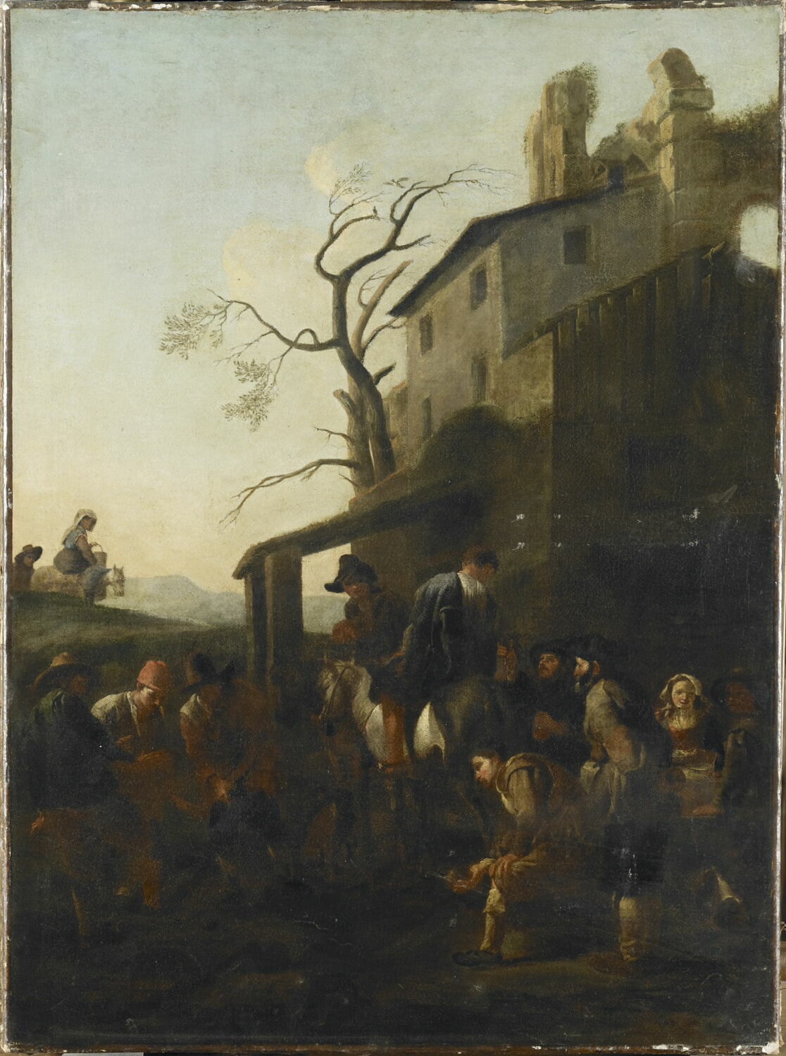 scène (jeu de boules, divertissement, paysan) ; cavalier ; village