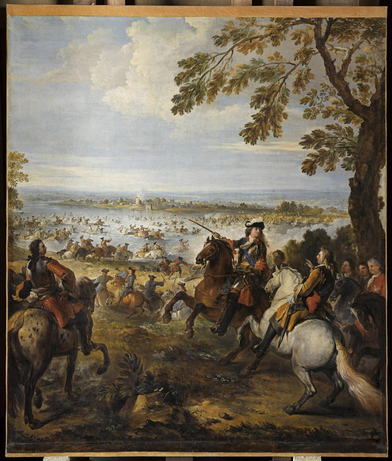 scène historique (mouvement d'armée, Louis XIV, Rhin) ; fond de paysage