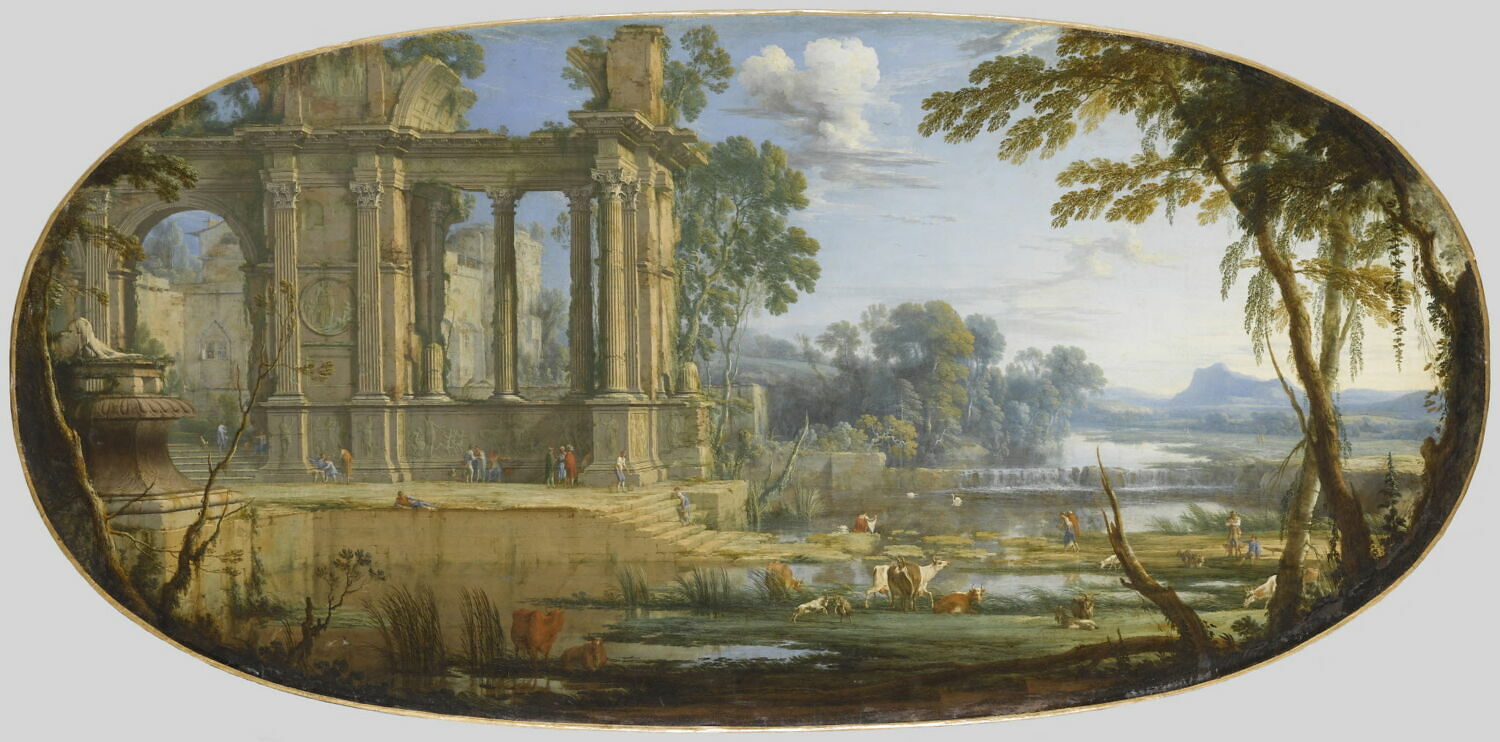 paysage (ruines, à l'antique, de fantaisie, feuillu, cours d'eau, vache, personnage)