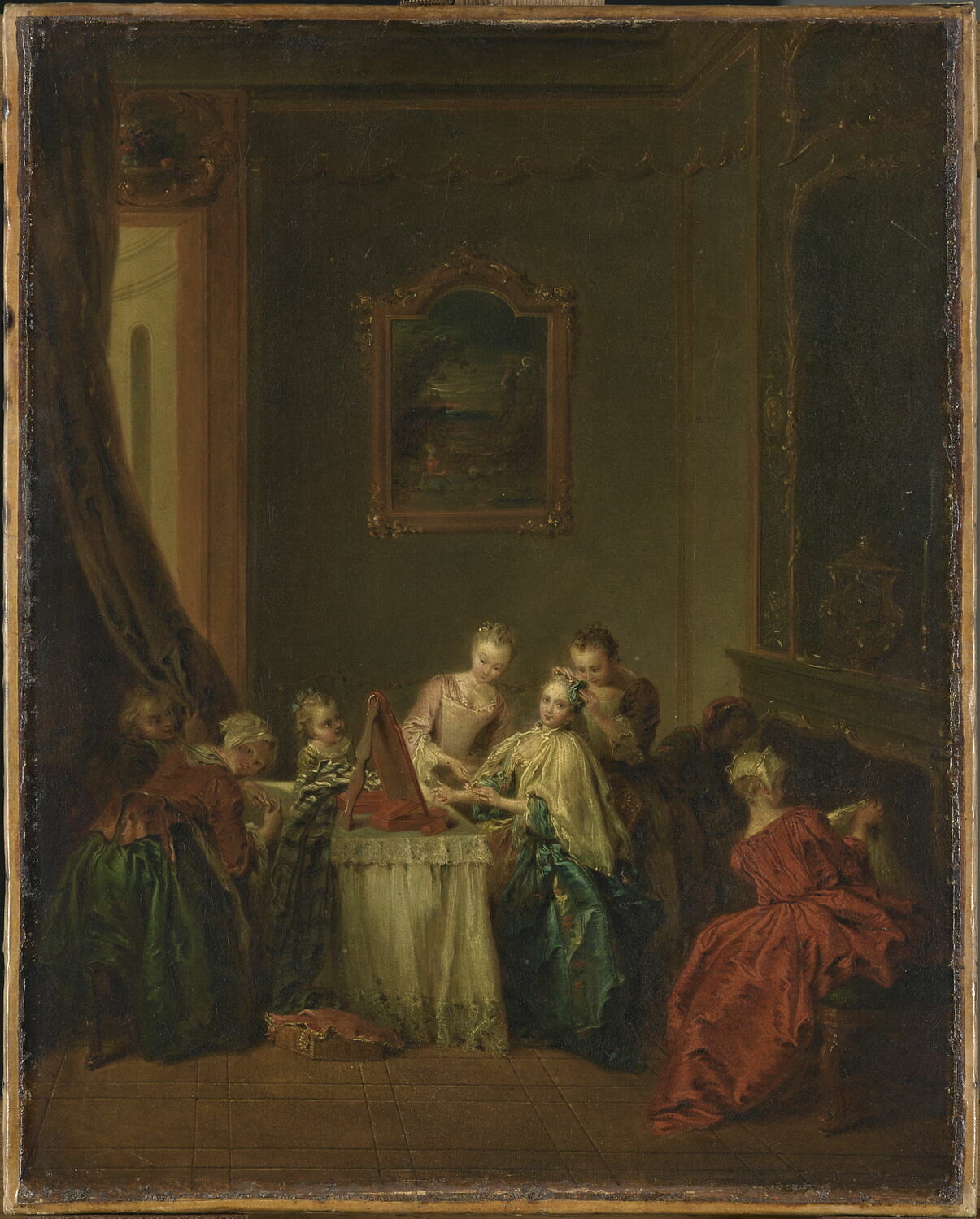 scène (intérieur, femme, coiffure, serviteur, enfant)