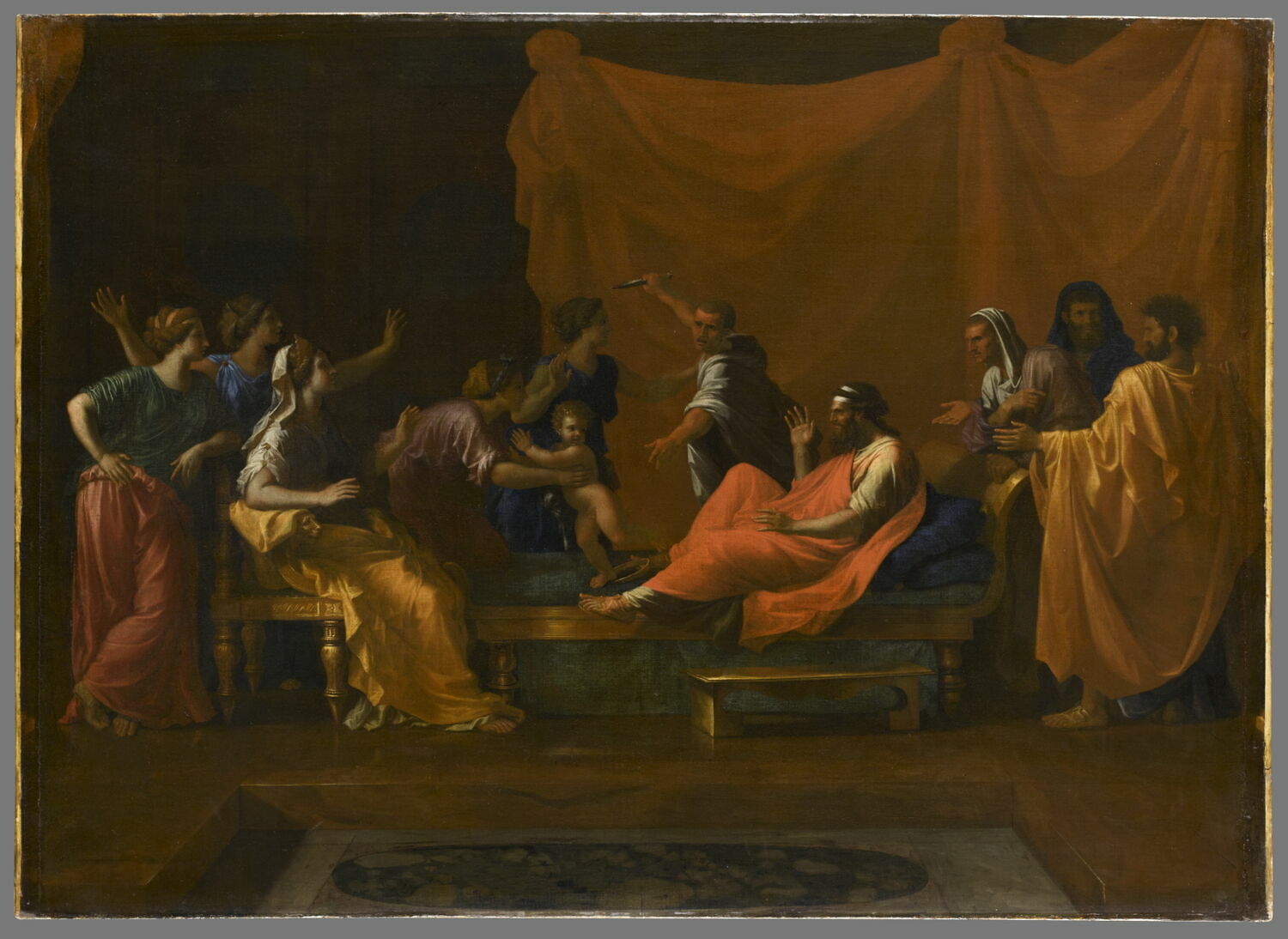 scène biblique (Moïse : enfant, couronne, souverain : Egypte, fille de Pharaon, serviteur, femme, homme, lit : à l'antique)