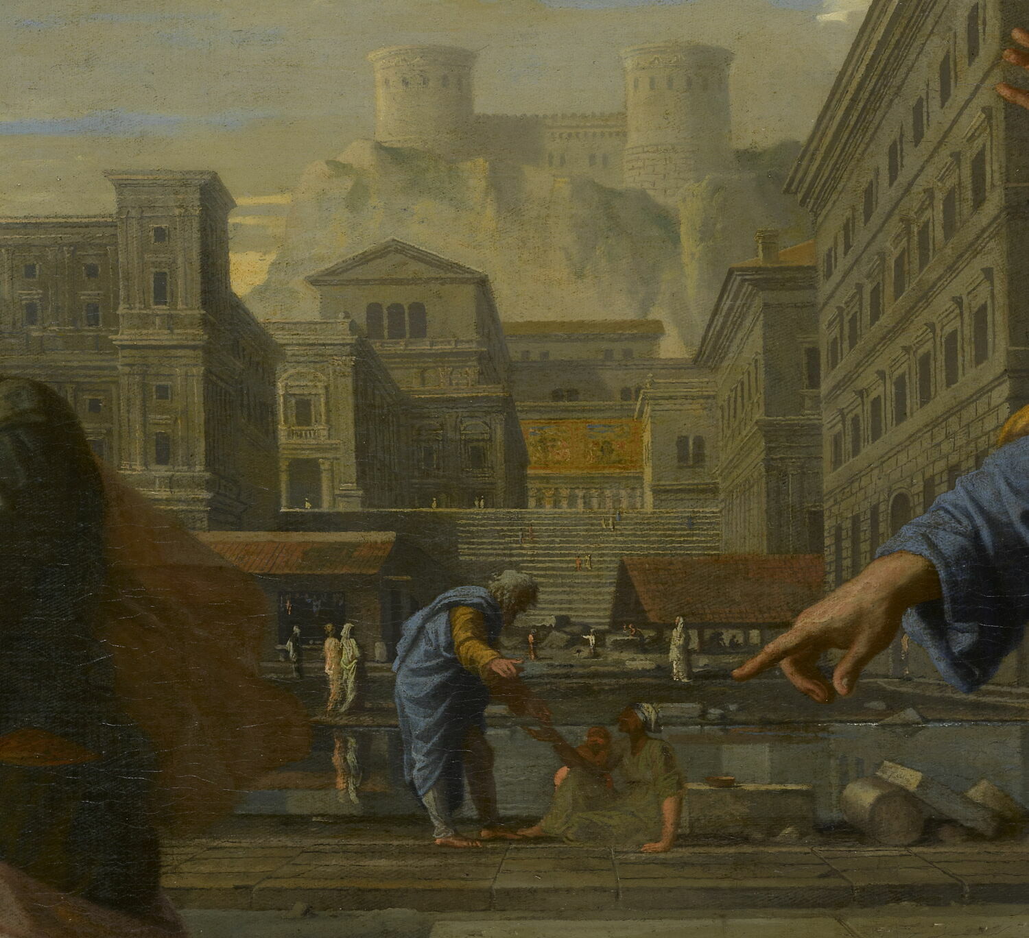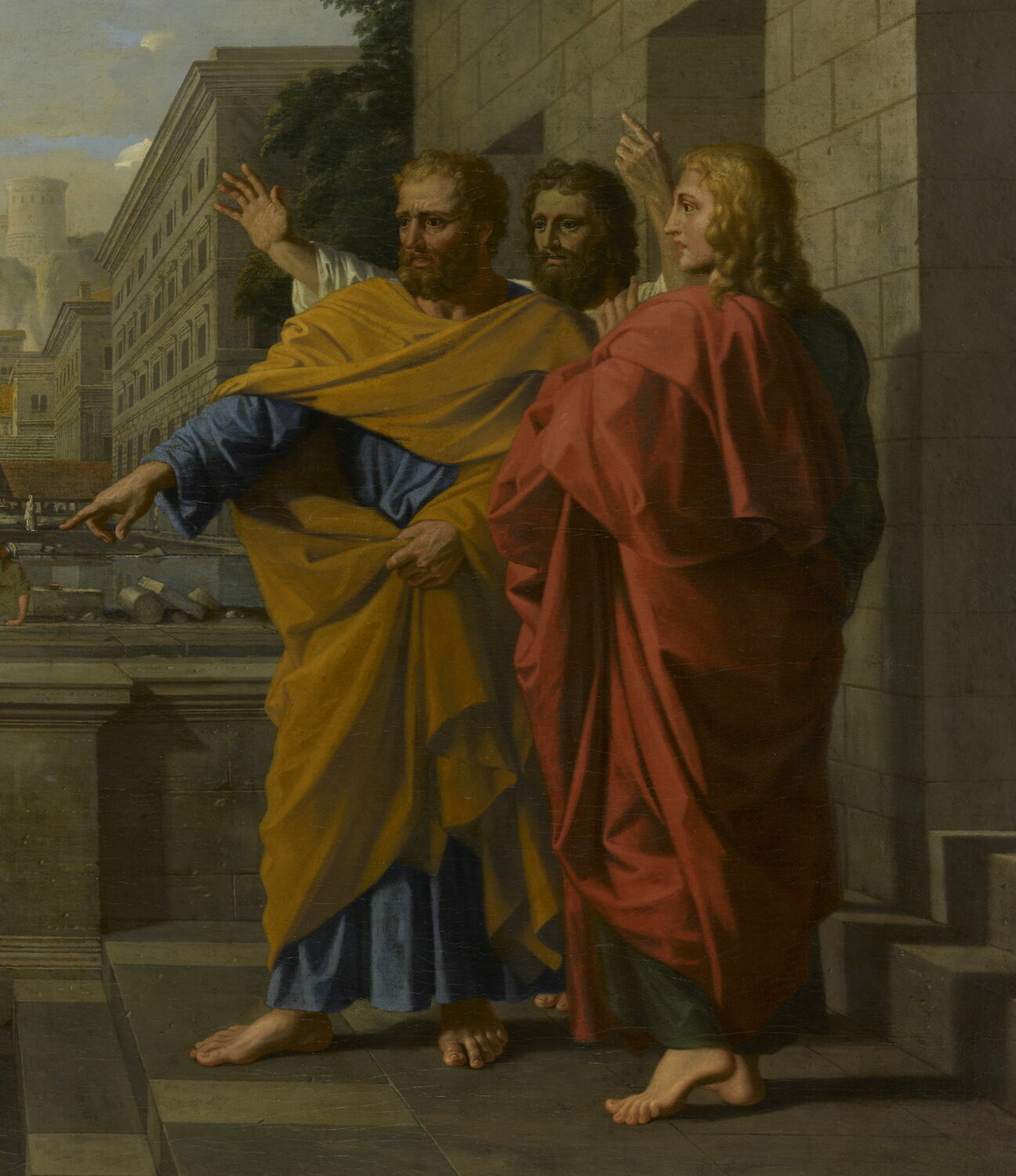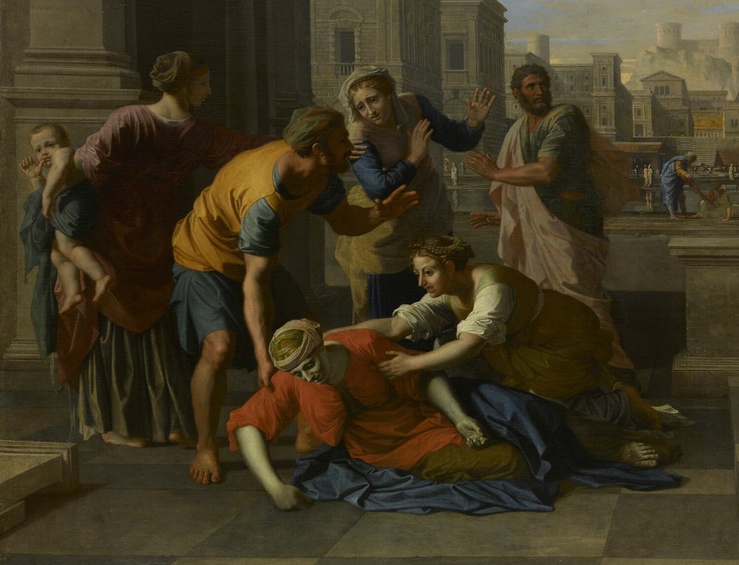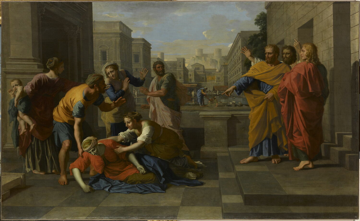 scène biblique (mort, Saphire, saint Pierre, apôtre) ; vue d'architecture (cadre urbain)