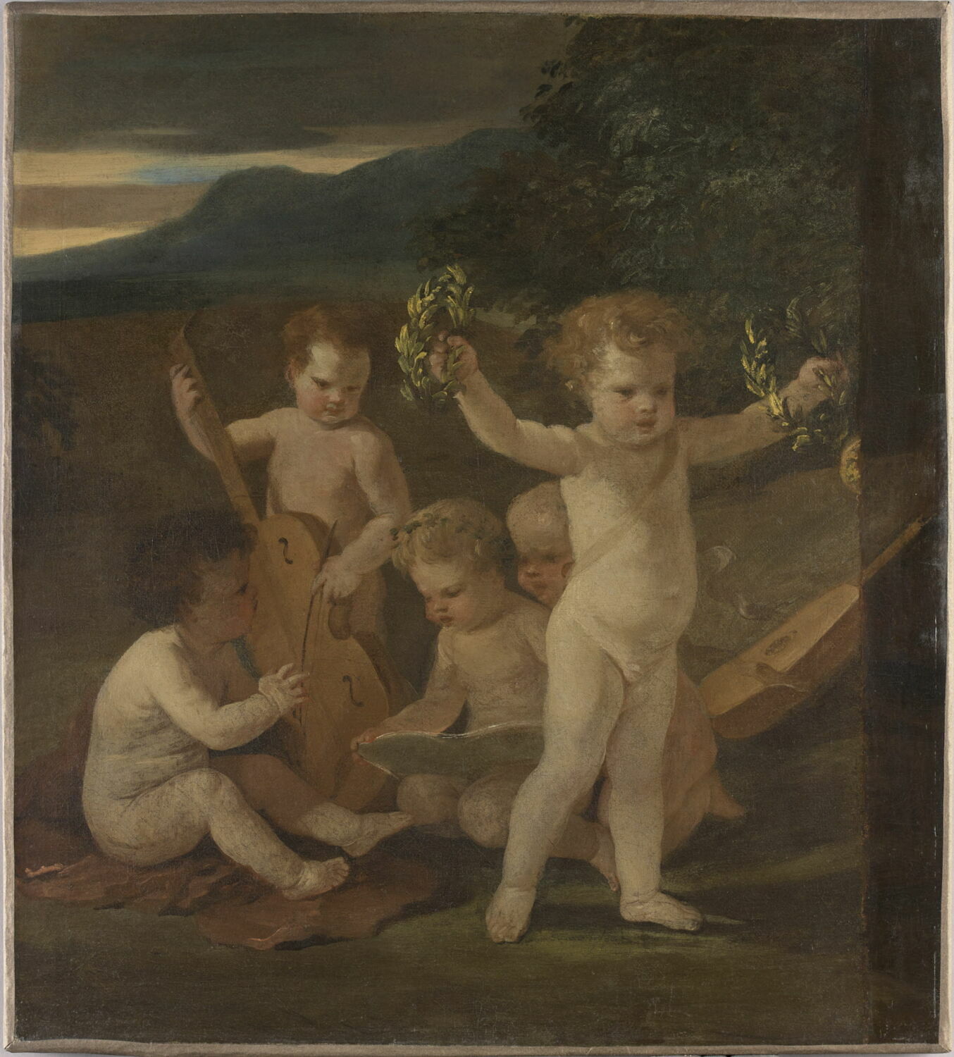 scène mythologique (formation instrumentale, Cupidon, couronne, laurier)