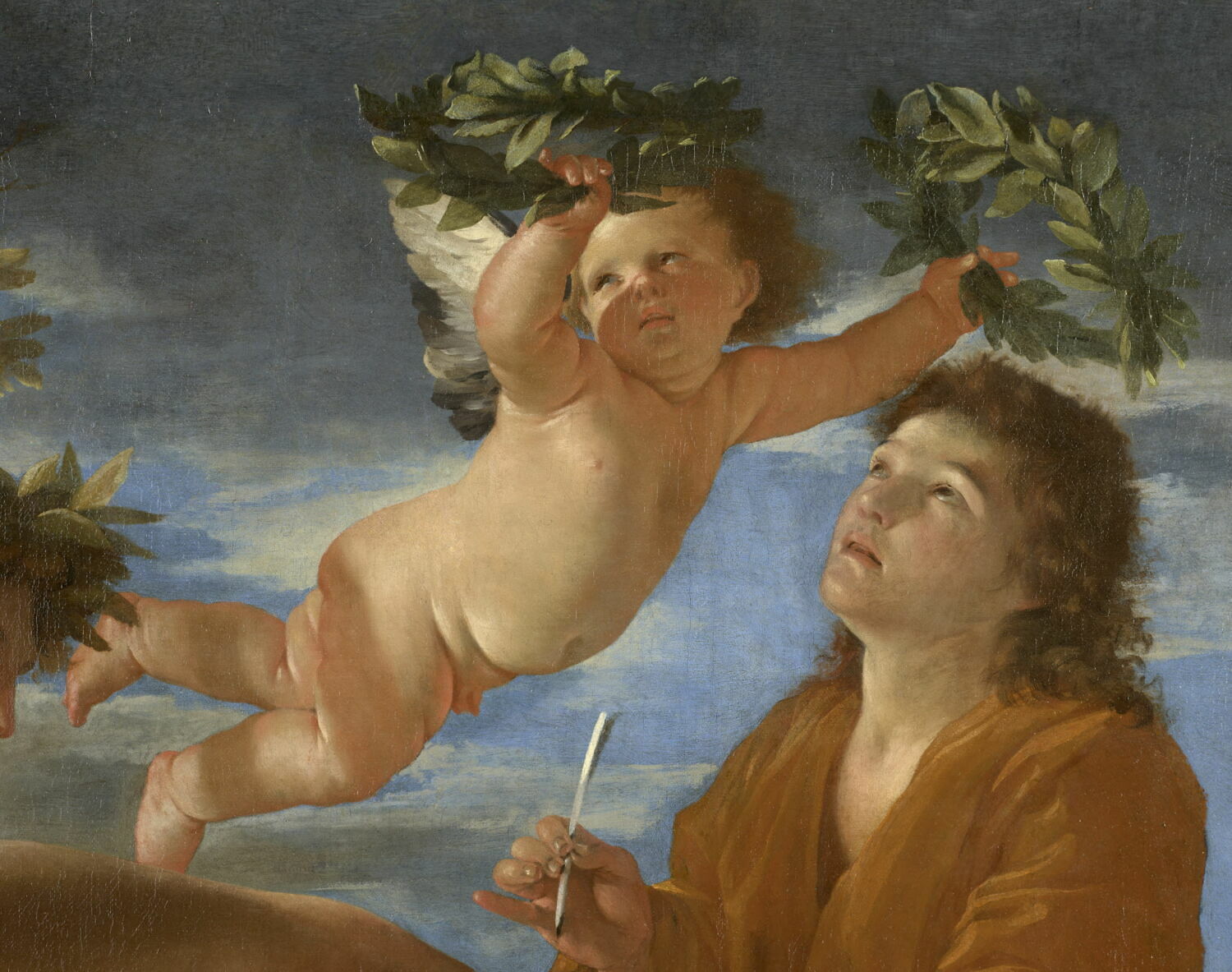 scène (muse, Apollon, homme de lettres : poésie, couronne : laurier, putti, lyre, feuillu)