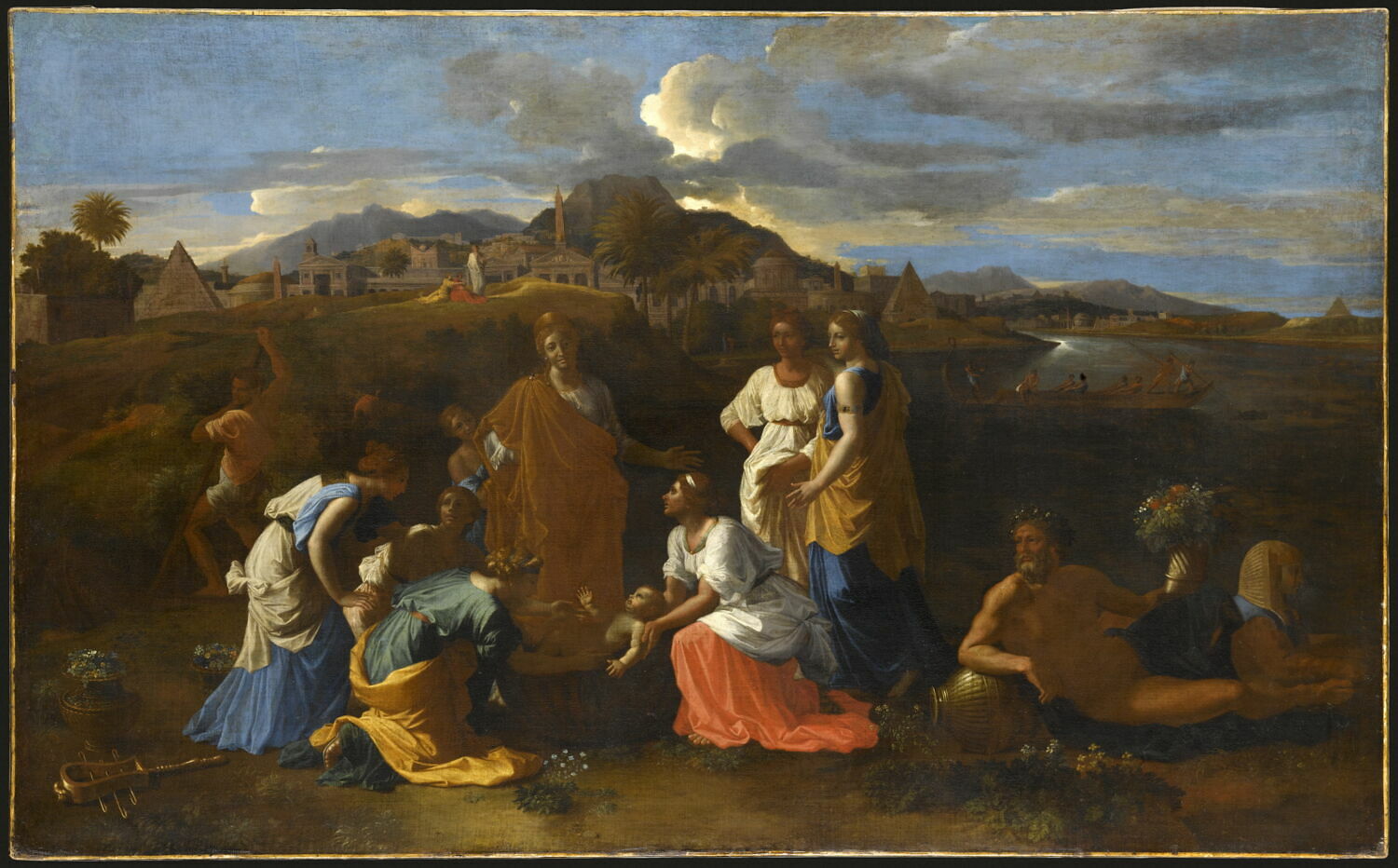 scène biblique (Moïse : nourrisson, fille de Pharaon, secours, serviteur, femme, allégorie : Nil, statue, sphinx) ; fond de paysage (ville, Egypte : de fantaisie, Nil, barque, pyramide, palmier, montagne)