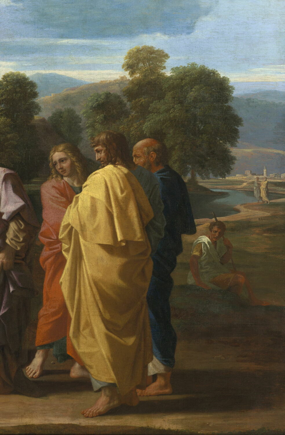 scène biblique (Jésus guérissant, aveugle, Les apôtres) ; fond de paysage (falaise, ville)