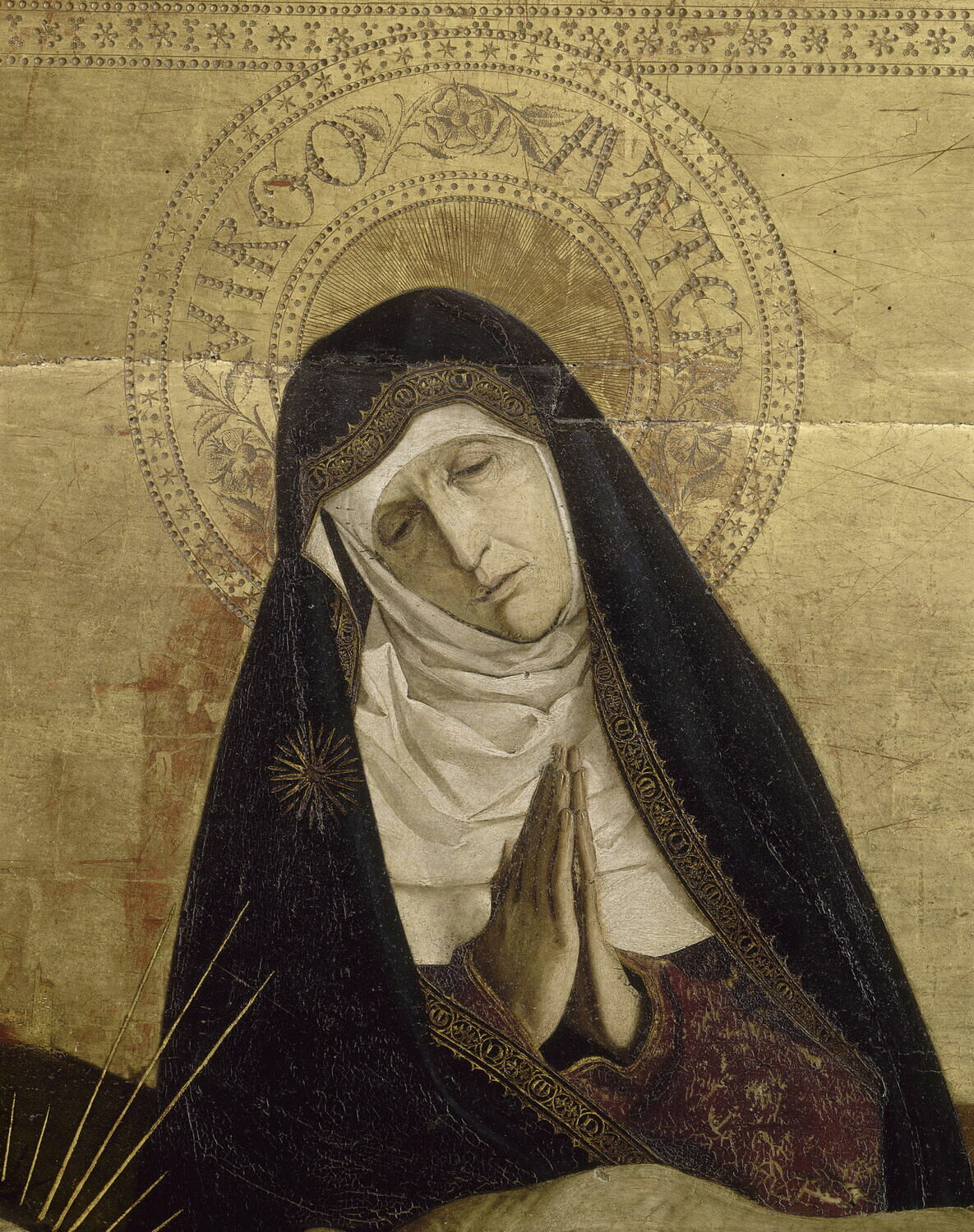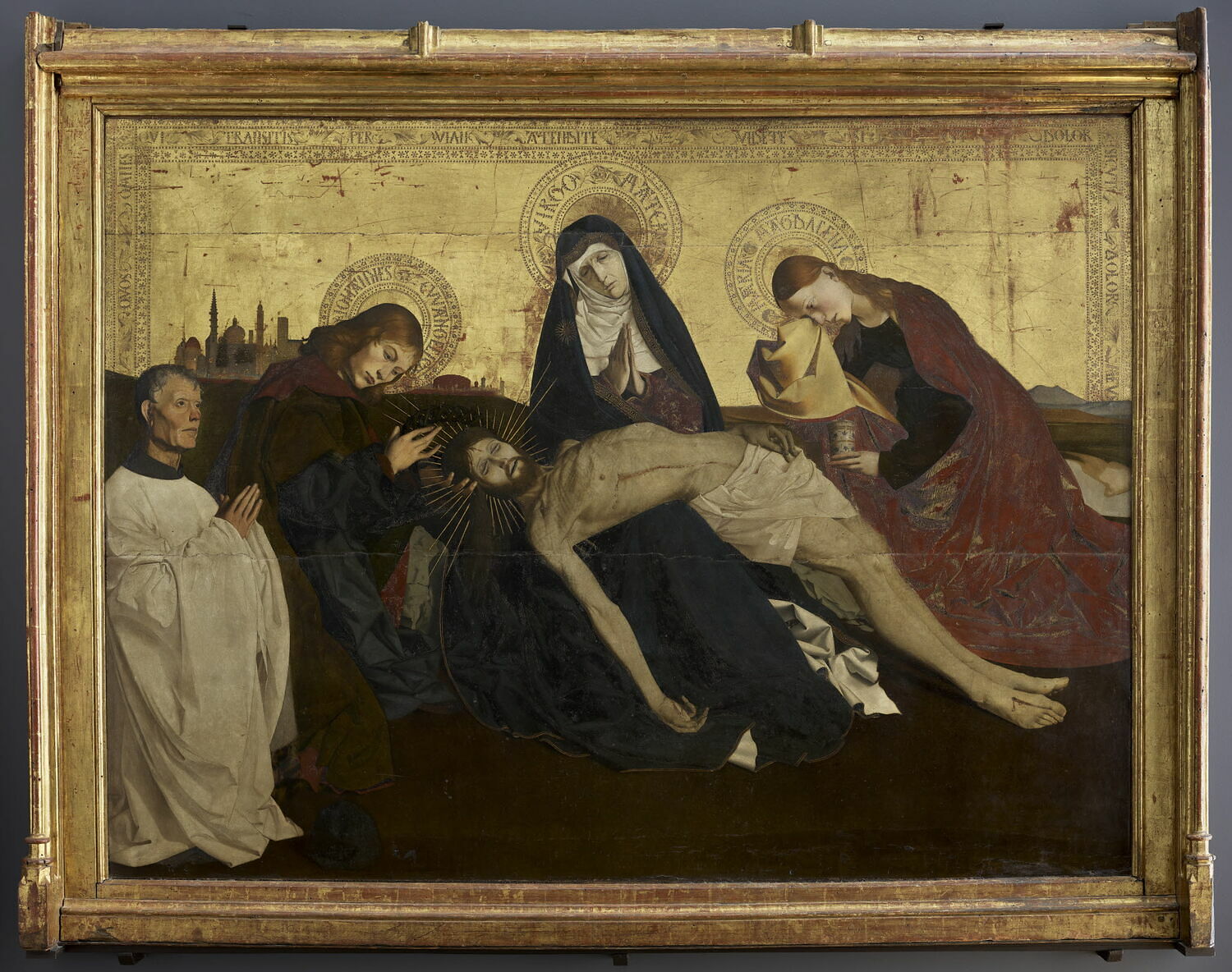 scène biblique (Christ mort, Vierge de douleur, sainte Madeleine, saint Jean) ; portrait d'inconnu (en donateur, homme, agenouillé, de trois-quarts) ; ville