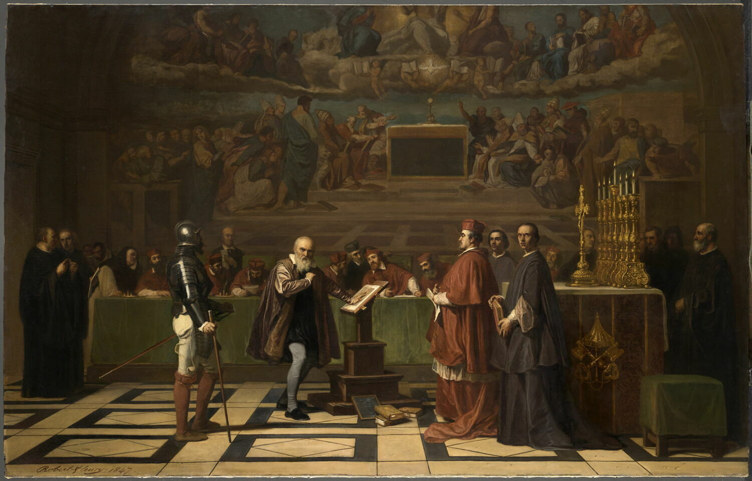 scène historique (Galilée, savant, physique, astronomie, justice ecclésiastique, abjuration, cardinal, soldat, autel, peinture, Rome, Vatican, intérieur)