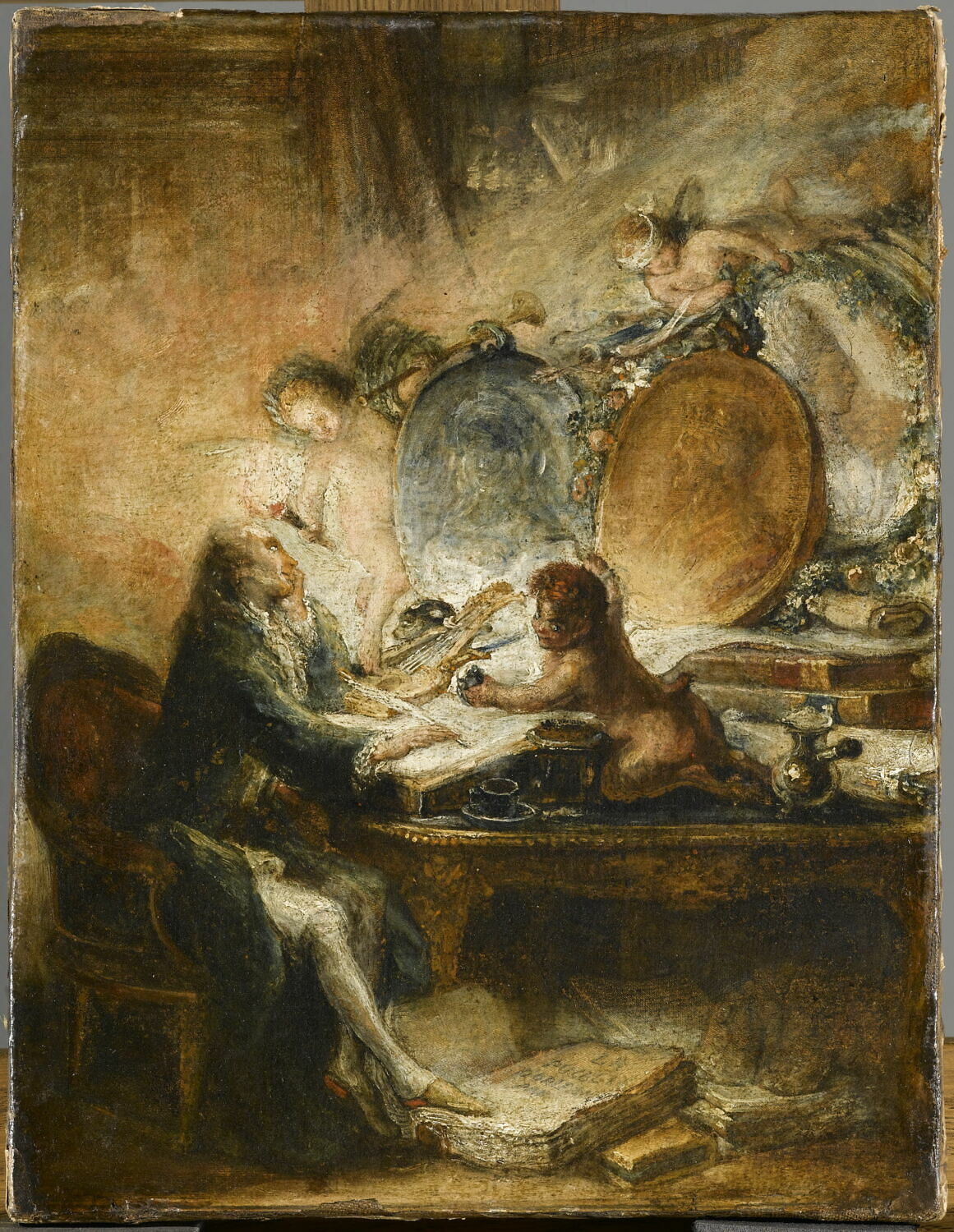 scène (Voltaire, écriture, allégorie : inspiration, songe, putti, trompette, peinture)