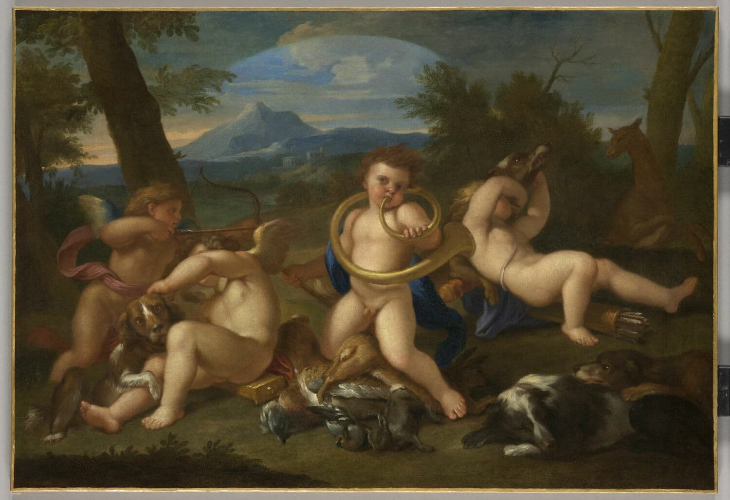 scène (putti : chasseur, trompe, arc, chien, gibier) ; fond de paysage (feuillu, montagne)