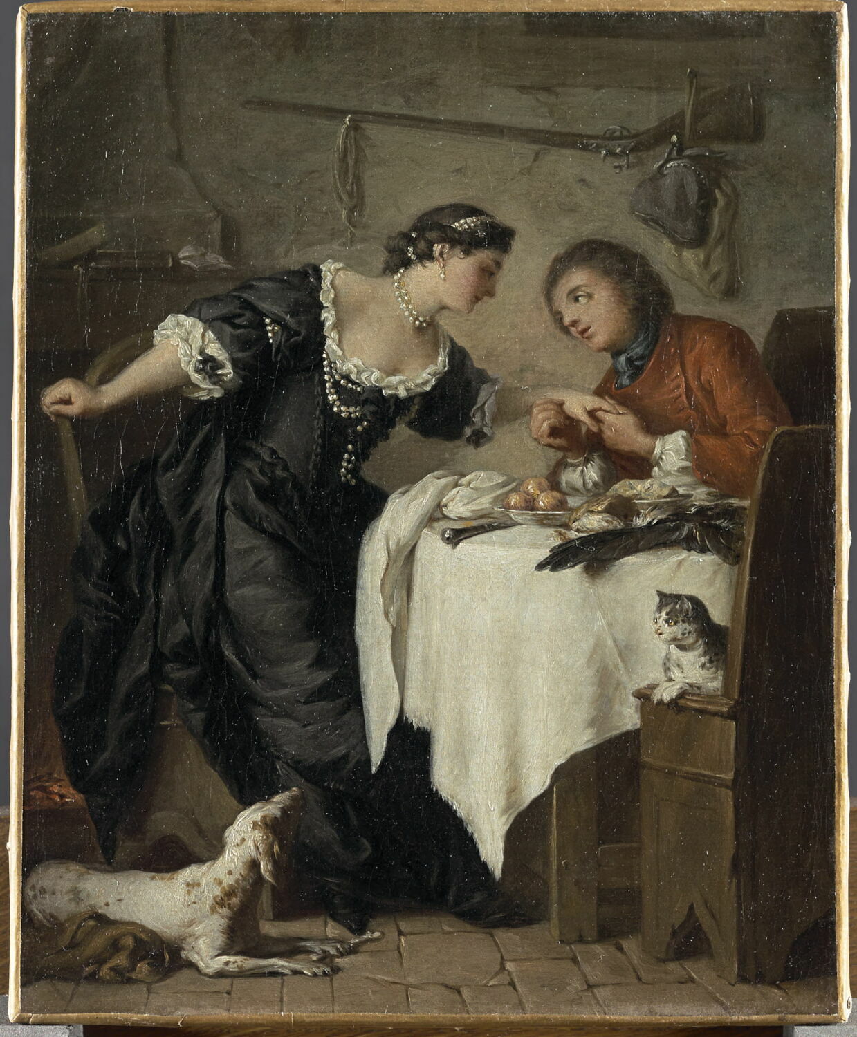 scène (galanterie, table, vaisselle, siège, couple, chien, chat, fusil)