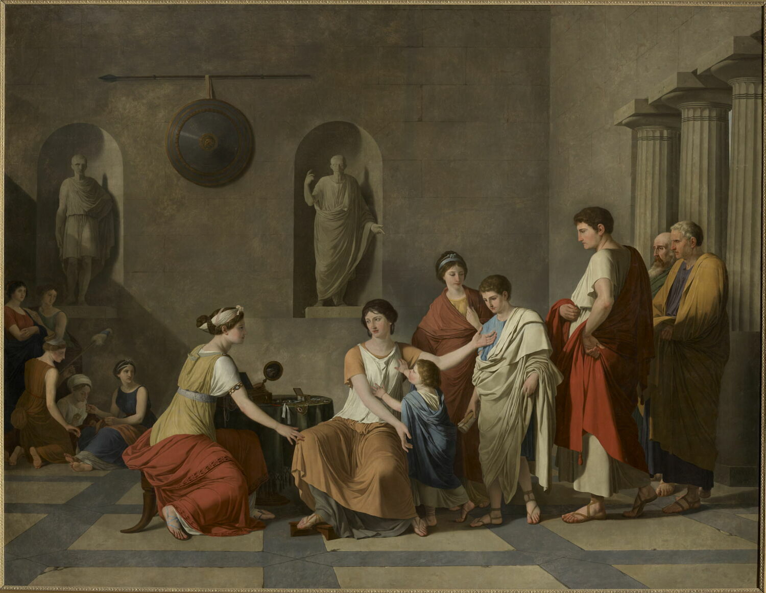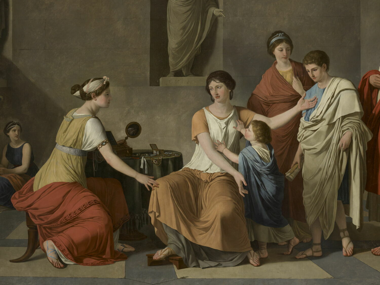 scène historique (Cornélie, enfant, homme, femme, table, siège, maison : intérieur, à l'antique, statue, antiquité romaine)