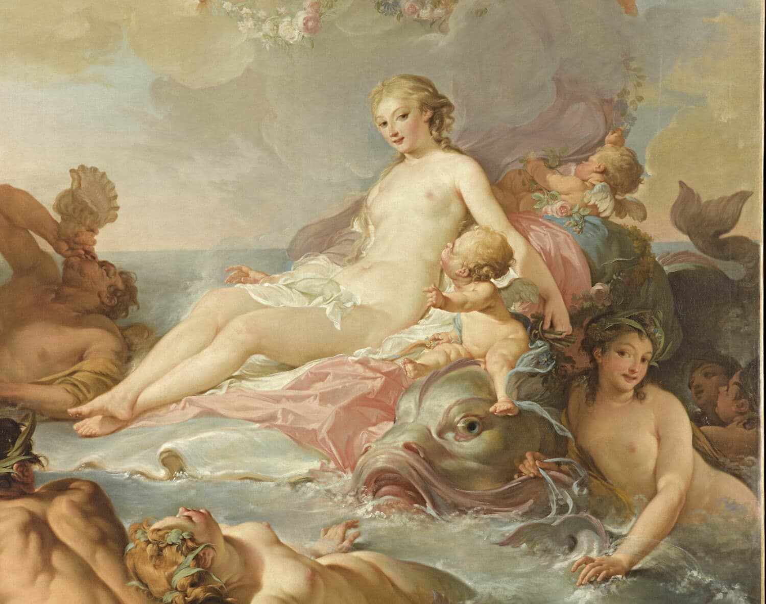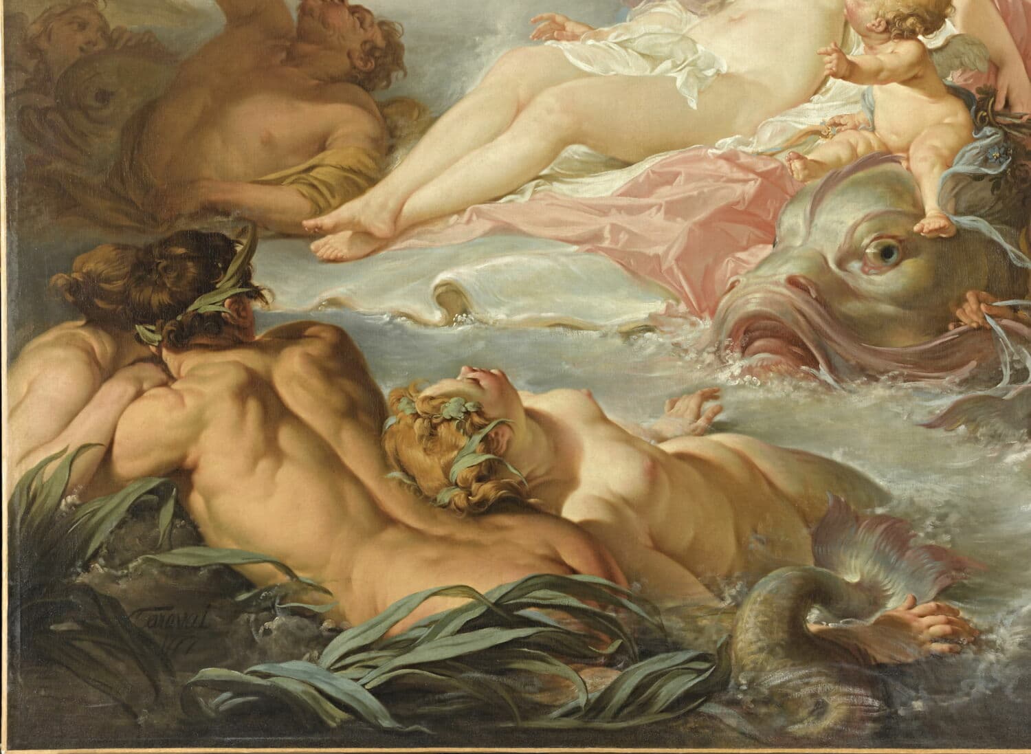 scène mythologique (Amphitrite, animal fabuleux, mer, sirène oiseau, anthropomorphe, putti, draperie)
