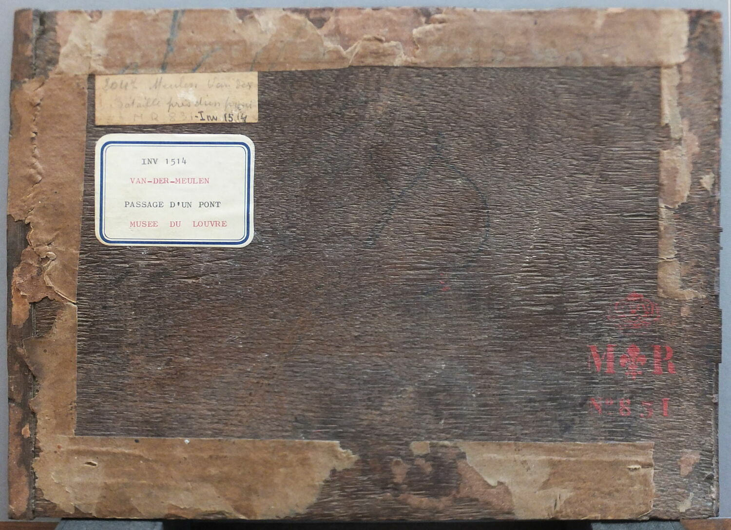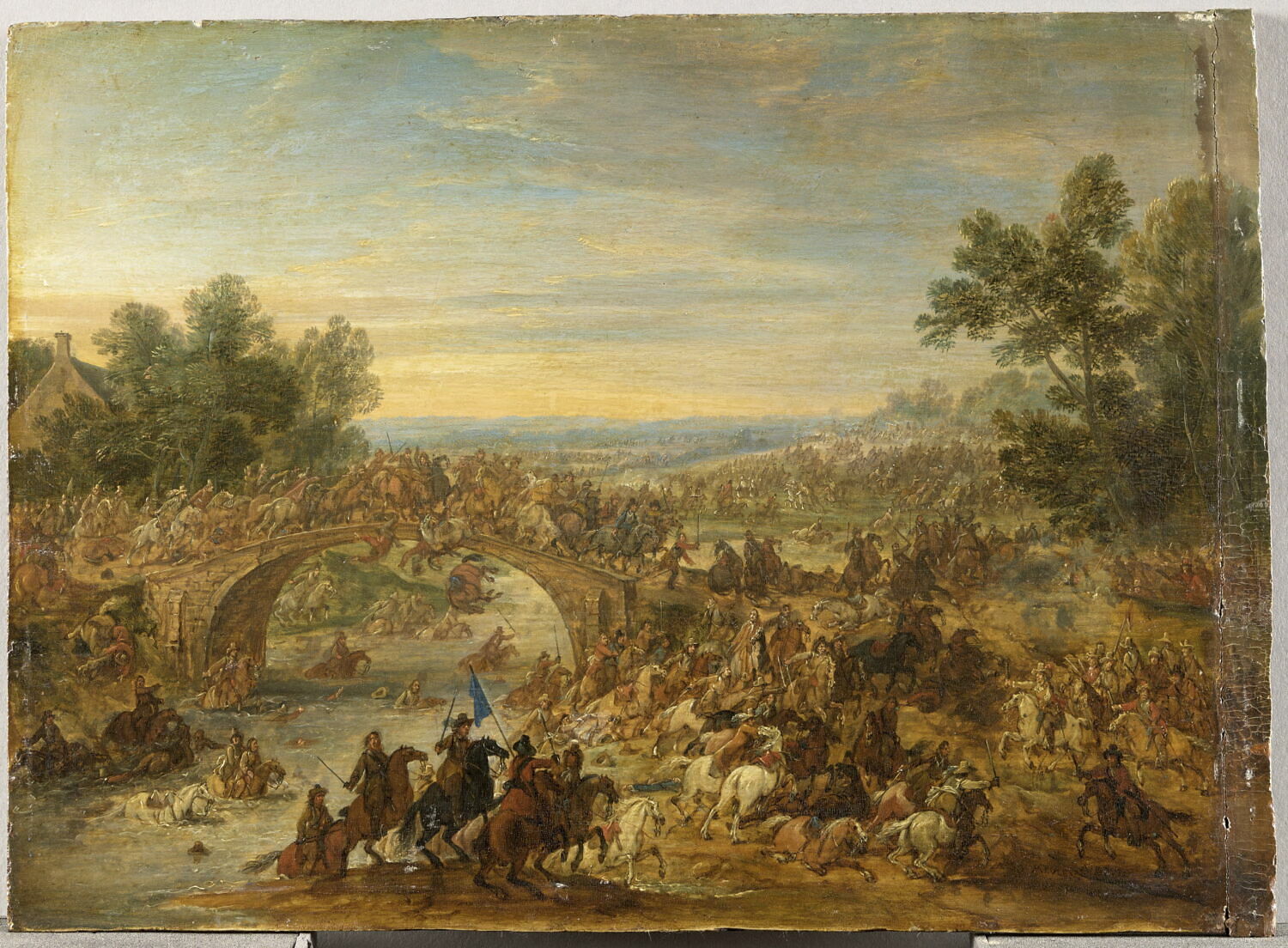 scène (combat : cavalerie, pont, rivière, feuillu) ; fond de paysage