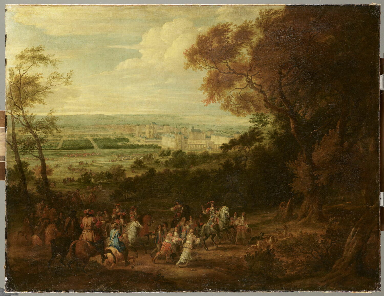 scène (Louis XIV, cavalier, chien) ; paysage (château : Vincennes, plaine, feuillu)