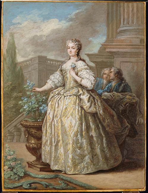 portrait (Marie Leczinska, femme, robe, serviteur : enfant, vase)