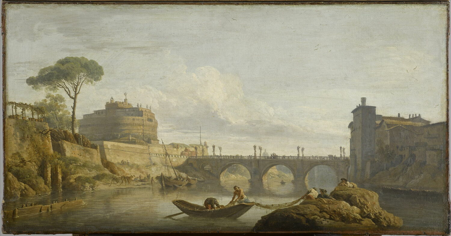 vue d'architecture (Rome, château, pont, Tibre, maison) ; bateau à voiles ; pêche aux engins ; barque ; résineux