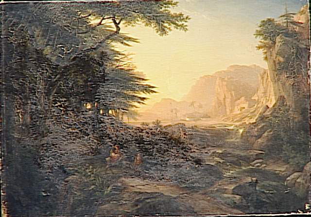 scène biblique (Fuite en Egypte) ; fond de paysage (montagne, résineux)