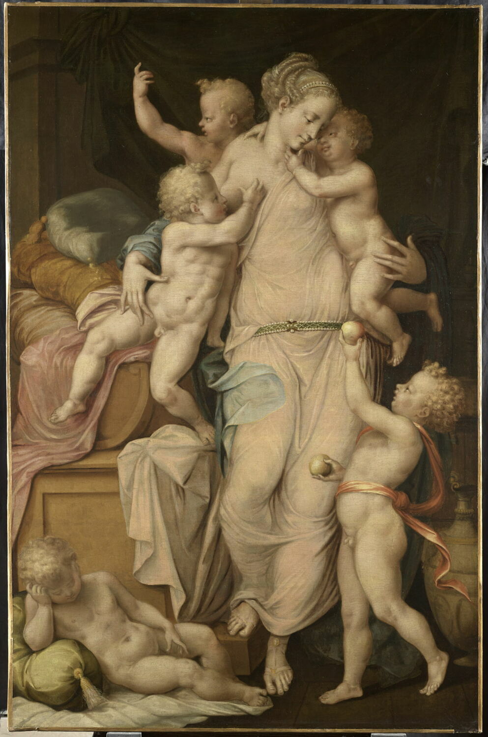 figure (allégorie : charité, femme : allaitement : nourrisson, en pied, de face, enfant, nudité, draperie, siège)