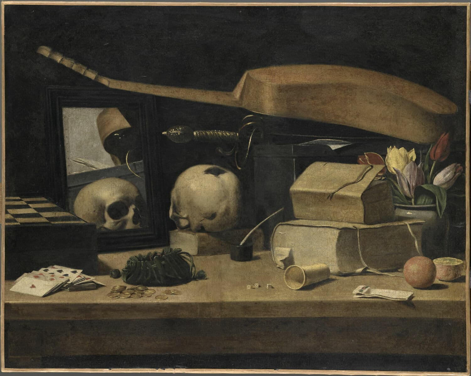 nature morte (table, crâne, livre, orange fruit, vase, tulipe, épée, jeu de dés, damier, viole de gambe, miroir, monnaie)