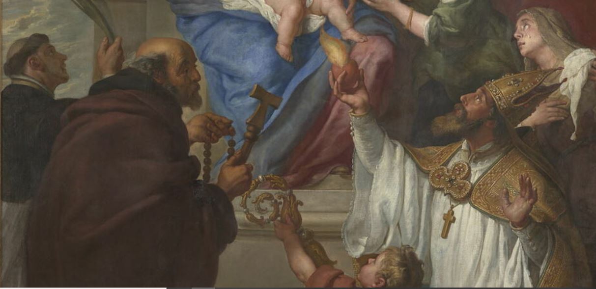 figures bibliques (Vierge à l'Enfant, ange, saint Etienne) ; palme ; groupe de figures (sainte Dorothée, sainte Barbe, sainte Madeleine de Ruzzi, saint Augustin d'Hippone, saint Antoine ermite)