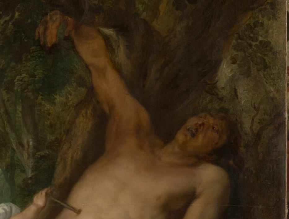 scène (saint Sébastien : mort, flèche, ange, secours, feuillu)