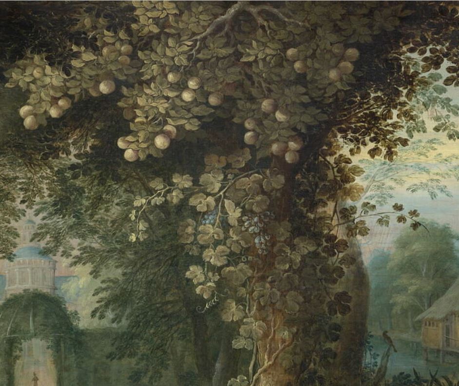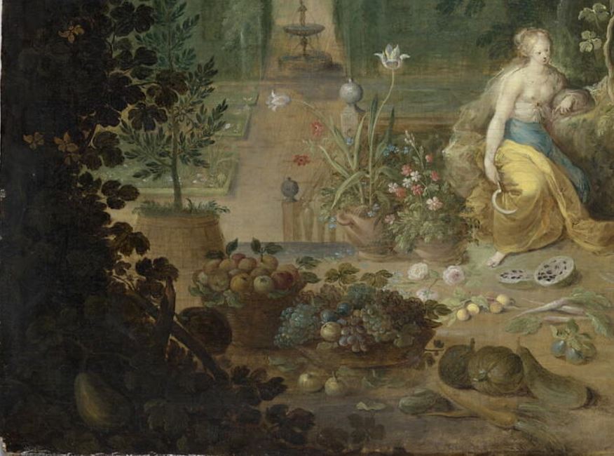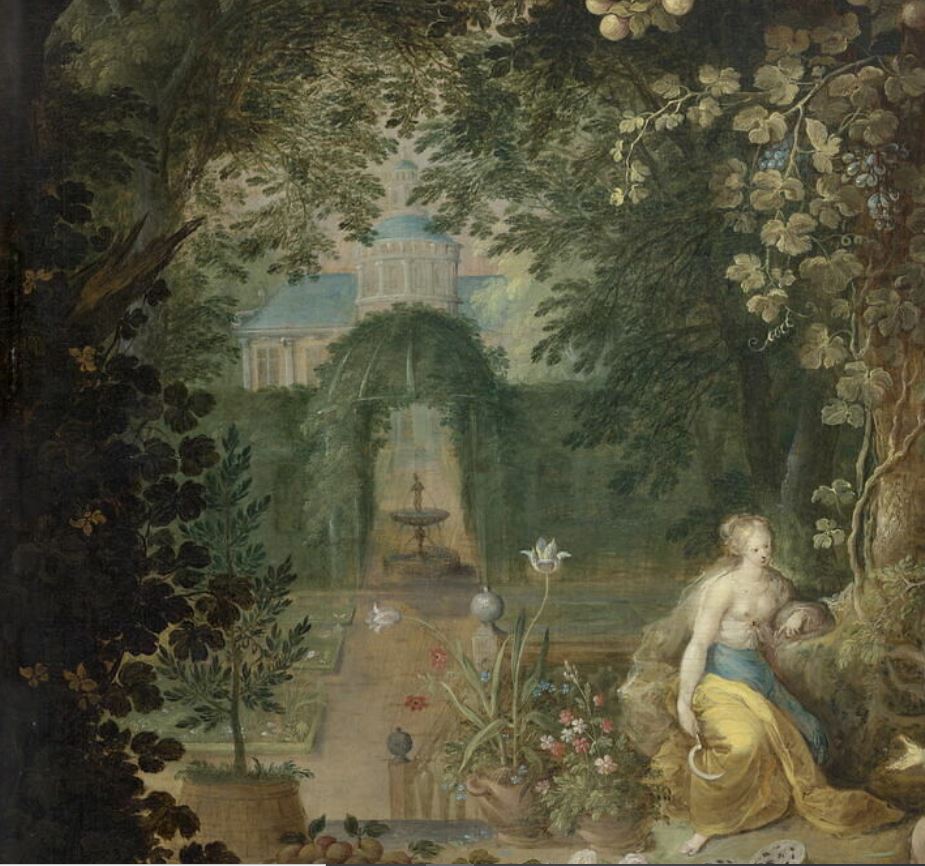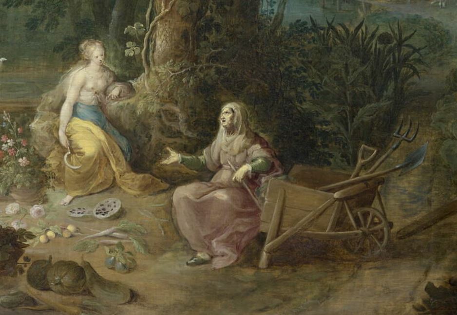 figures mythologiques (Vertumne, Pomone) ; paysage (arbre fruitier : en fruits, brouette, jardin, fleur, tulipe, fontaine, maison)
