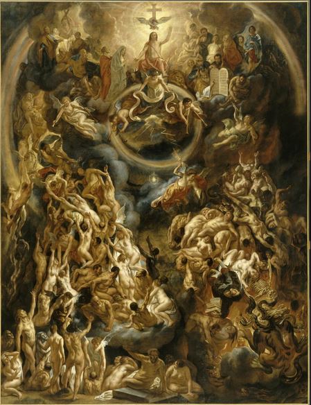 scène biblique (Jugement Dernier, chute, nudité, ange, Christ juge, Vierge, Saint-Esprit : colombe, Enfer)