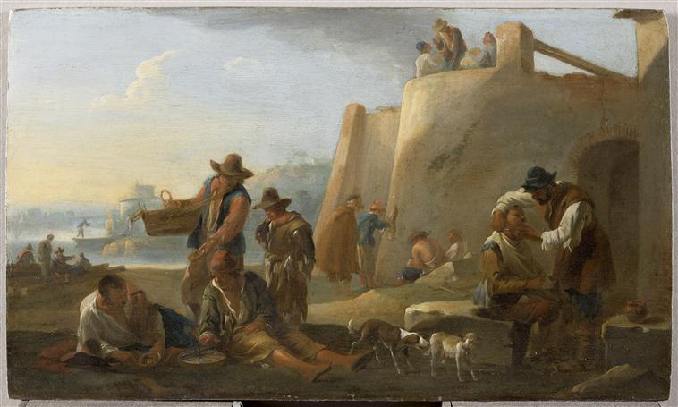 scène (service, rasage, homme, jeu, port, Naples, chien)
