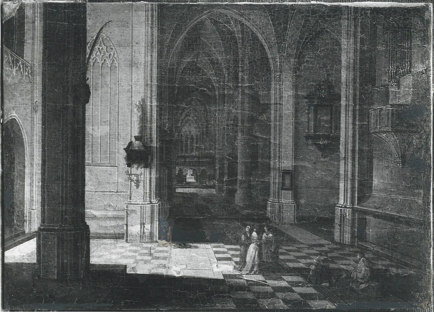 INTERIEUR D'EGLISE : GROUPE DE PERSONNAGES CONVERSANT DANS UN BAS COTE