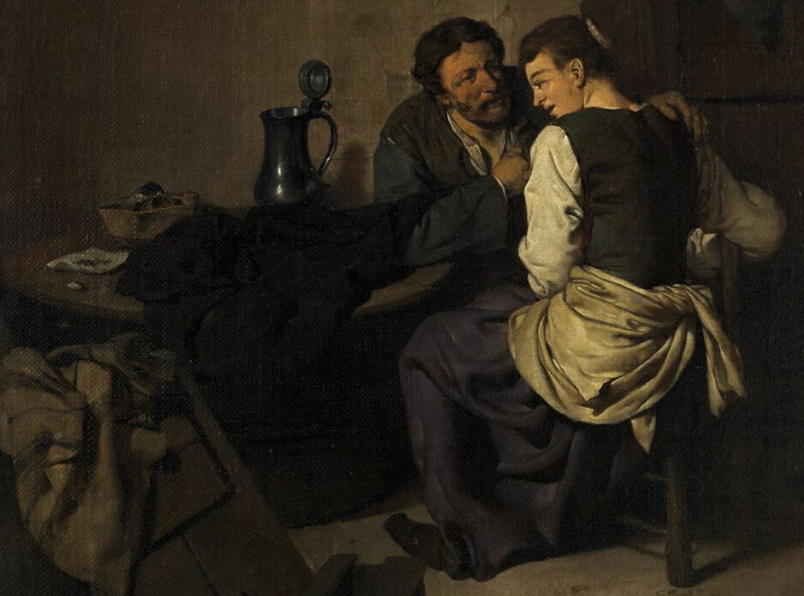 vue d'intérieur (couple, conversation, pièce d'habitation, pot : étain)