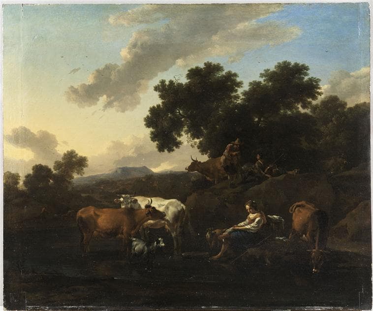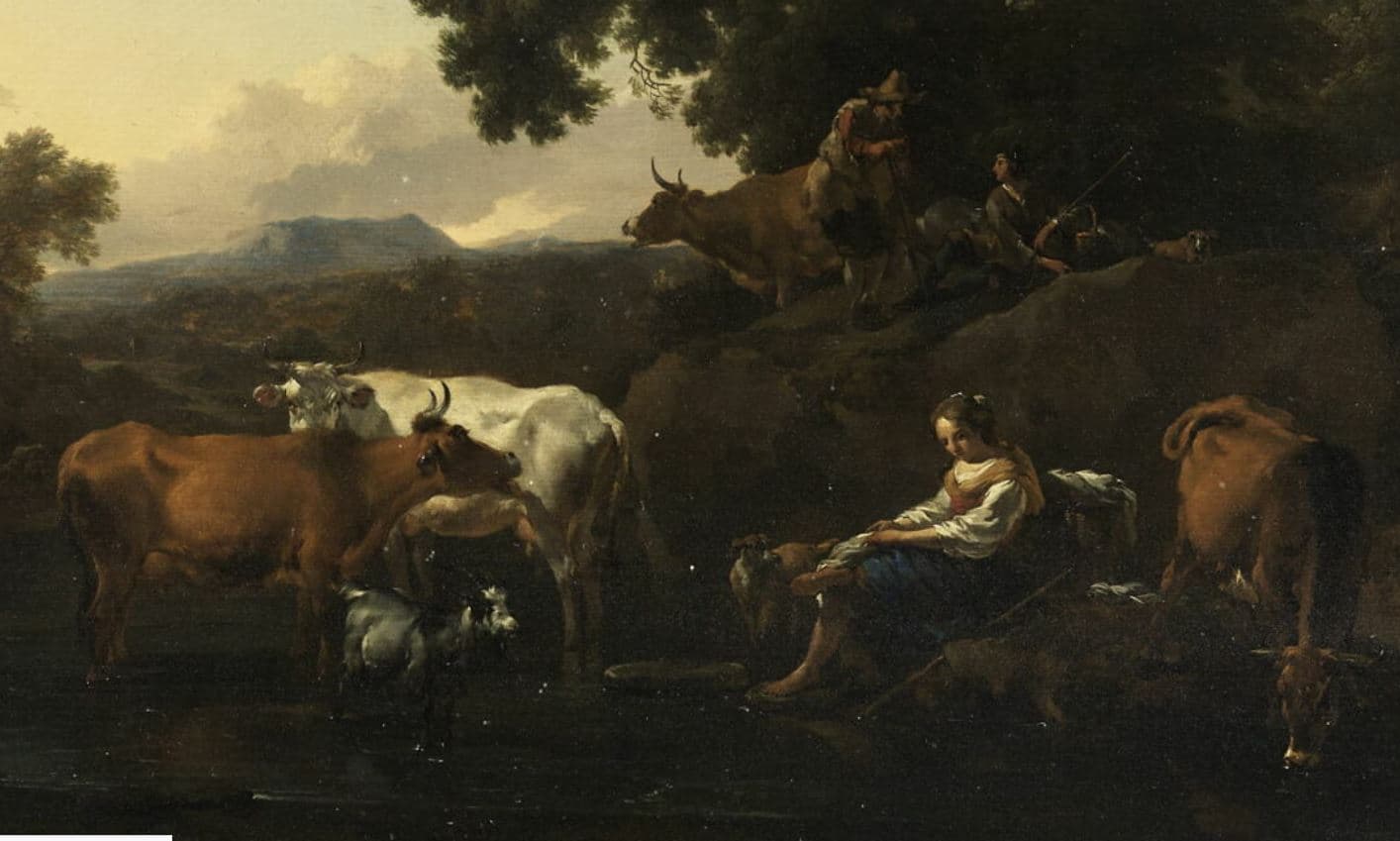 Pâtres gardant un troupeau au bord de l'eau