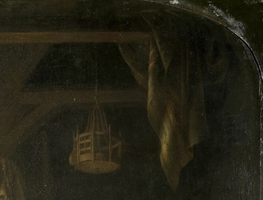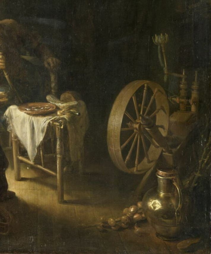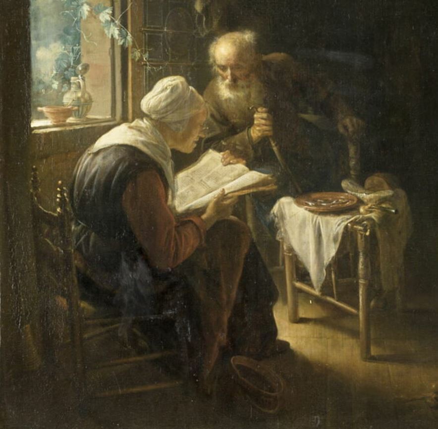scène biblique (intérieur, Tobie, ?, sainte Anne, ?, vieux, vieille, couple, lecture, livre : Bible, Judaïsme, fenêtre, intérieur, rouet, pot)