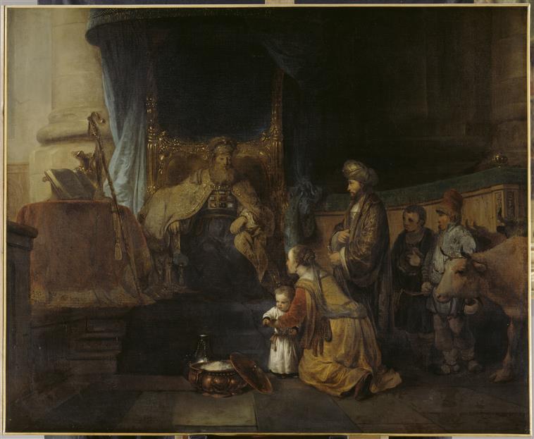 scène biblique (Elie, trône, Anne mère de Samuel, présentation, Samuel : enfant, livre, Elqana, boeuf, élément d'architecture)