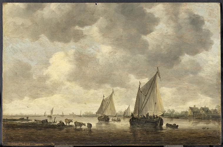 Deux grandes barques à voiles et bestiaux sur la rive