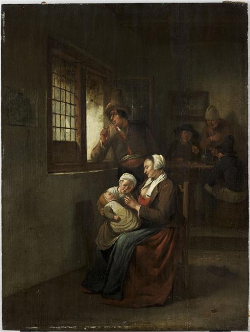 scène (femme, enfant, nourrisson, homme, intérieur, fenêtre)