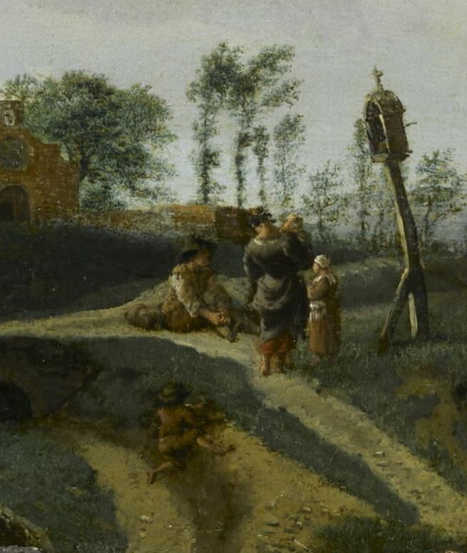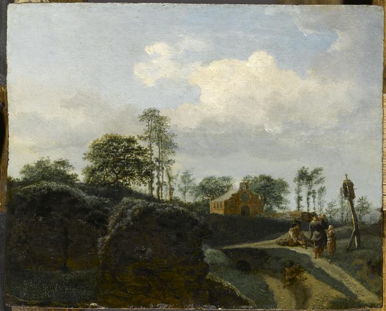 paysage (rocher, chemin, feuillu, maison, paysan, oratoire)