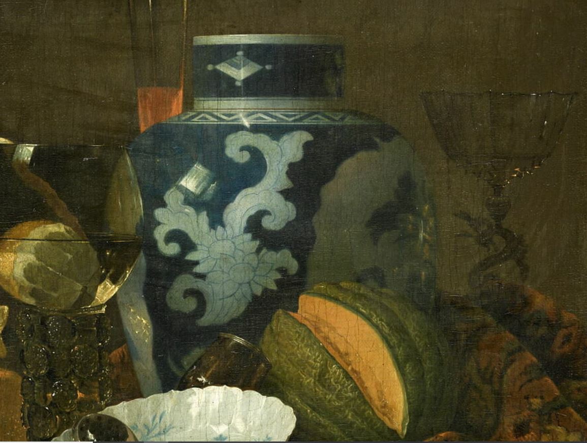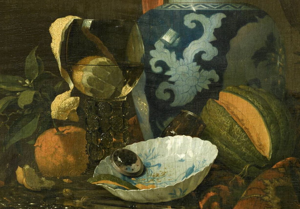 nature morte (vase : céramique, fruit, verre à pied : verrerie, vaisselle, melon, tapis)
