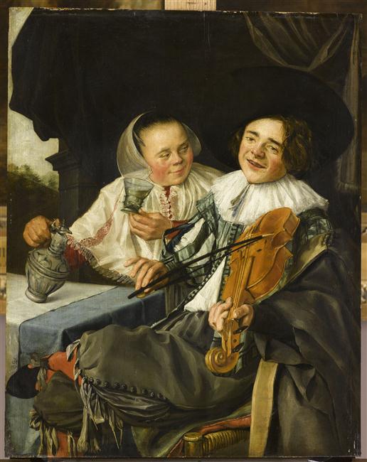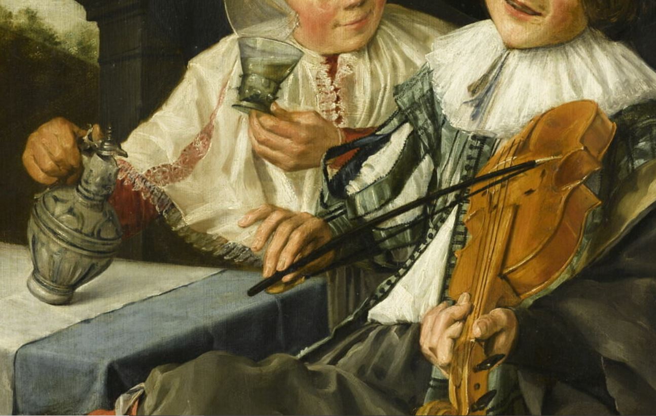 scène (homme, violon, femme, galanterie, boisson, verre à pied, pot)