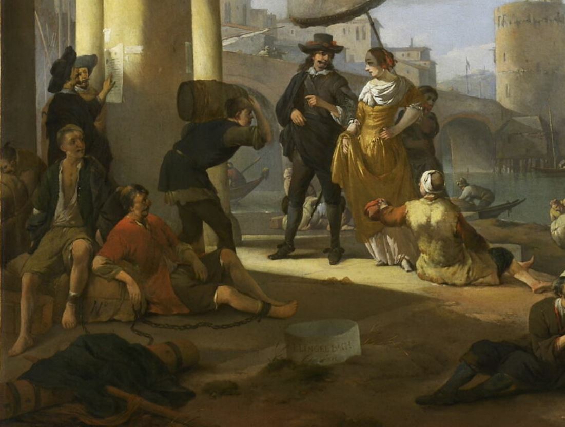 scène (port, Italie, bateau, homme, femme, portage, gueux, ombrelle, colonne)