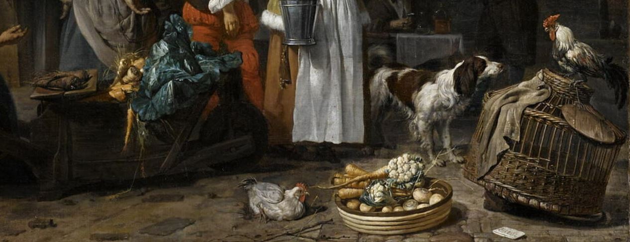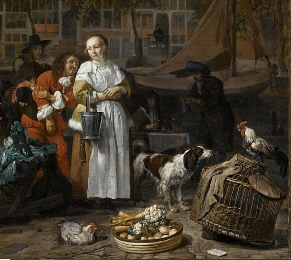 scène (marché, Amsterdam, panier, cage, coq, chien, feuillu, canal, voilier, maison)