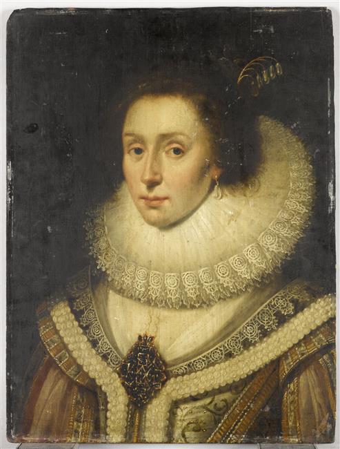 portrait (Stuart Elisabeth, reine : Bohême, femme, en buste, de trois-quarts, col : dentelle, bijou)