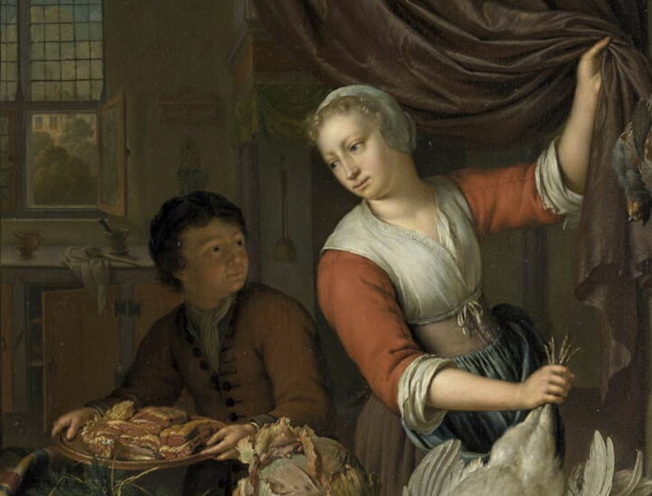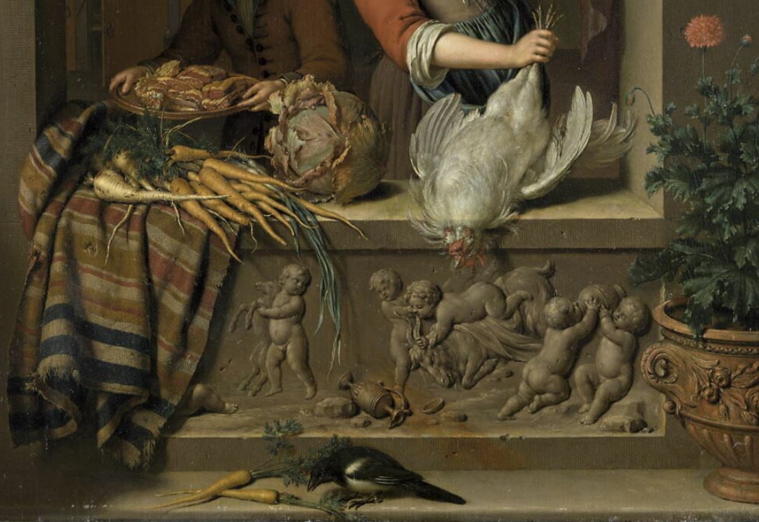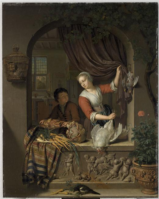 scène (femme, préparation des aliments, volaille, cuisine, fenêtre, tenture) ; nature morte (volaille, légume, chou, carotte) ; cage ; baie ; relief ; vase ; arbuste