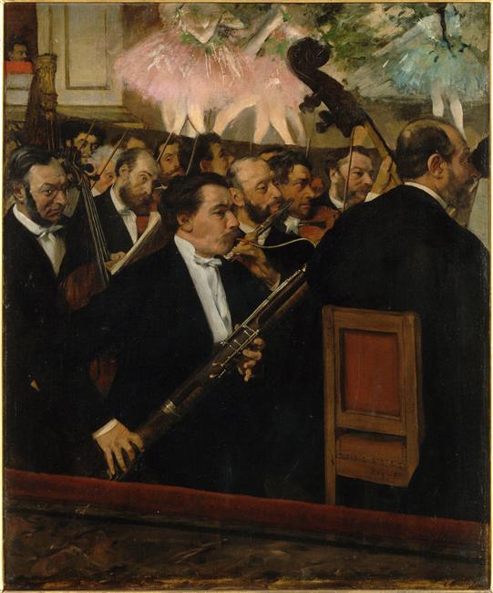 scène (orchestre, plateau de scène, art de la danse, musicien, musique, violon, harpe, basson, flûte traversière, violoncelle, contrebasse, danseur, spectateur, femme, figuration partielle) ; portrait collectif (Dihau Désiré, Pillet Louis Marie, Pagans Lorenzo, Piot-Normand Alexandre, Souquet Louis, ?, Pillot Adolphe Jean Désiré, ?, Altes Henry, Gard Mr, Lancien Zéphirin Joseph, Gout Jean Nicolas Joseph, Gouffe Achille Henri Victor, Chabrier Emmanuel, musicien, peintre)