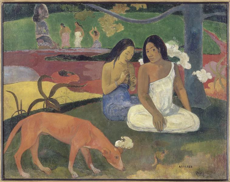 scène (femme, Tahitien, paysage, chien, flûte à bec, dévotion : paganisme, statue)
