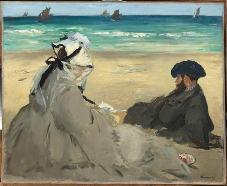 scène (plage, Manet Suzanne, assis, de trois-quarts, divertissement, lecture, Manet Eugène, homme, couché, de trois-quarts, accoudé) ; fond de paysage (mer, voilier, Berck)