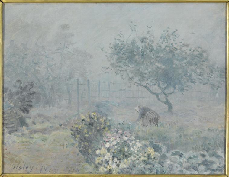 paysage (Louveciennes, jardin, arbre, personnage, brouillard)