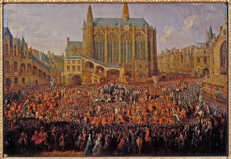 scène historique (Louis XV, palais de justice, Paris : place, foule, carrosse, Orléans Philippe d', cortège, noblesse, Bourbon duc de, église)