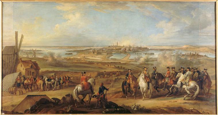 scène historique (guerre de siège, ville : Mons-en-Hainaut, Conti prince de, Boufflers Joseph duc de, Estrées comte d', camp militaire) ; moulin