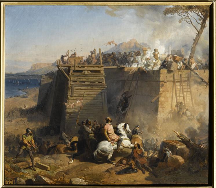 scène historique (croisade, assaut, machine de guerre, Baudouin Ier de Jérusalem)